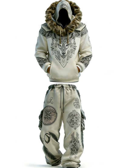 Men's Nordic Mythology Wolf Head Print Hoodie Set