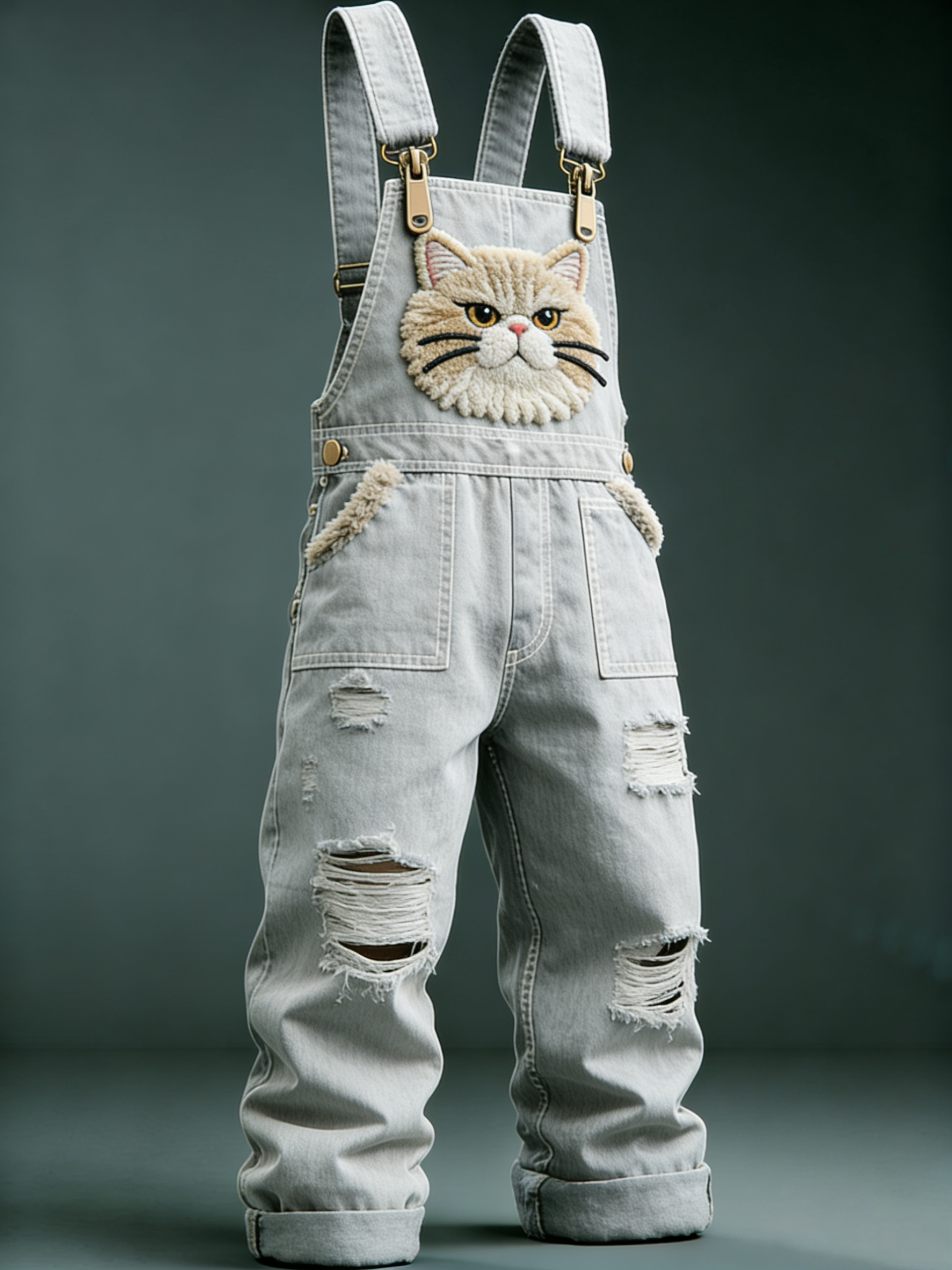 Men'S Orange Cat Embroidered Plush Pocket Trendy Design, Light Gray Perforated Denim Overalls