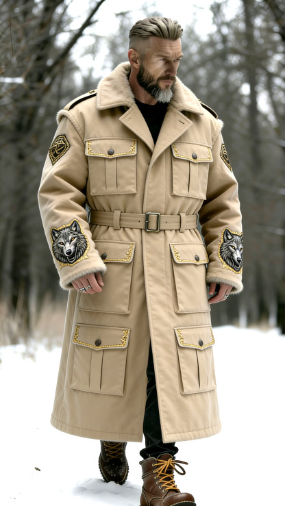 Men'S Outdoor Battlefield Wolf King Khaki Workwear, Multi Pocket Wolf Head Embroidered Warm Coat