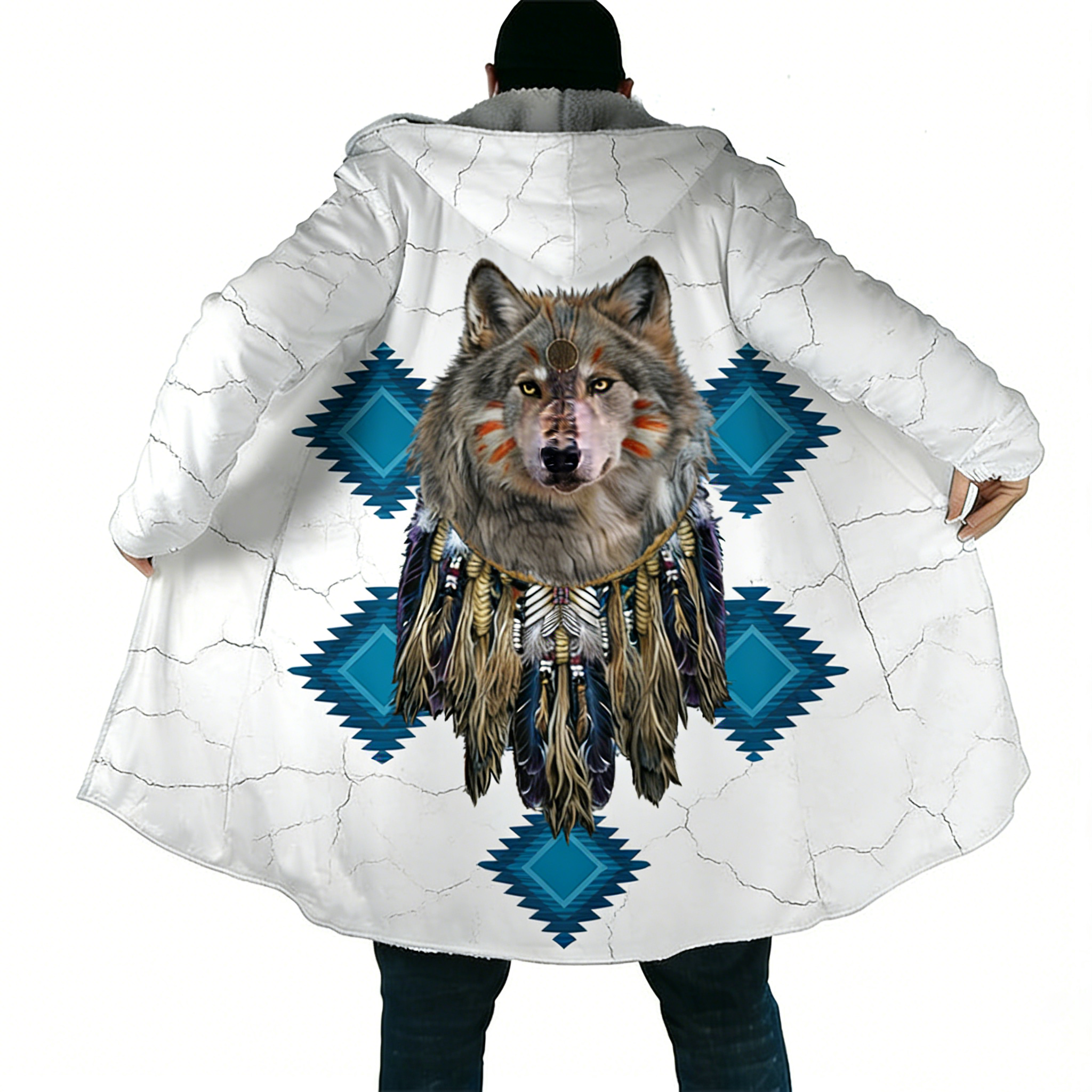 Men'S Painted Lone Wolf Tribe Totem Hooded Cloak Casual Jacket