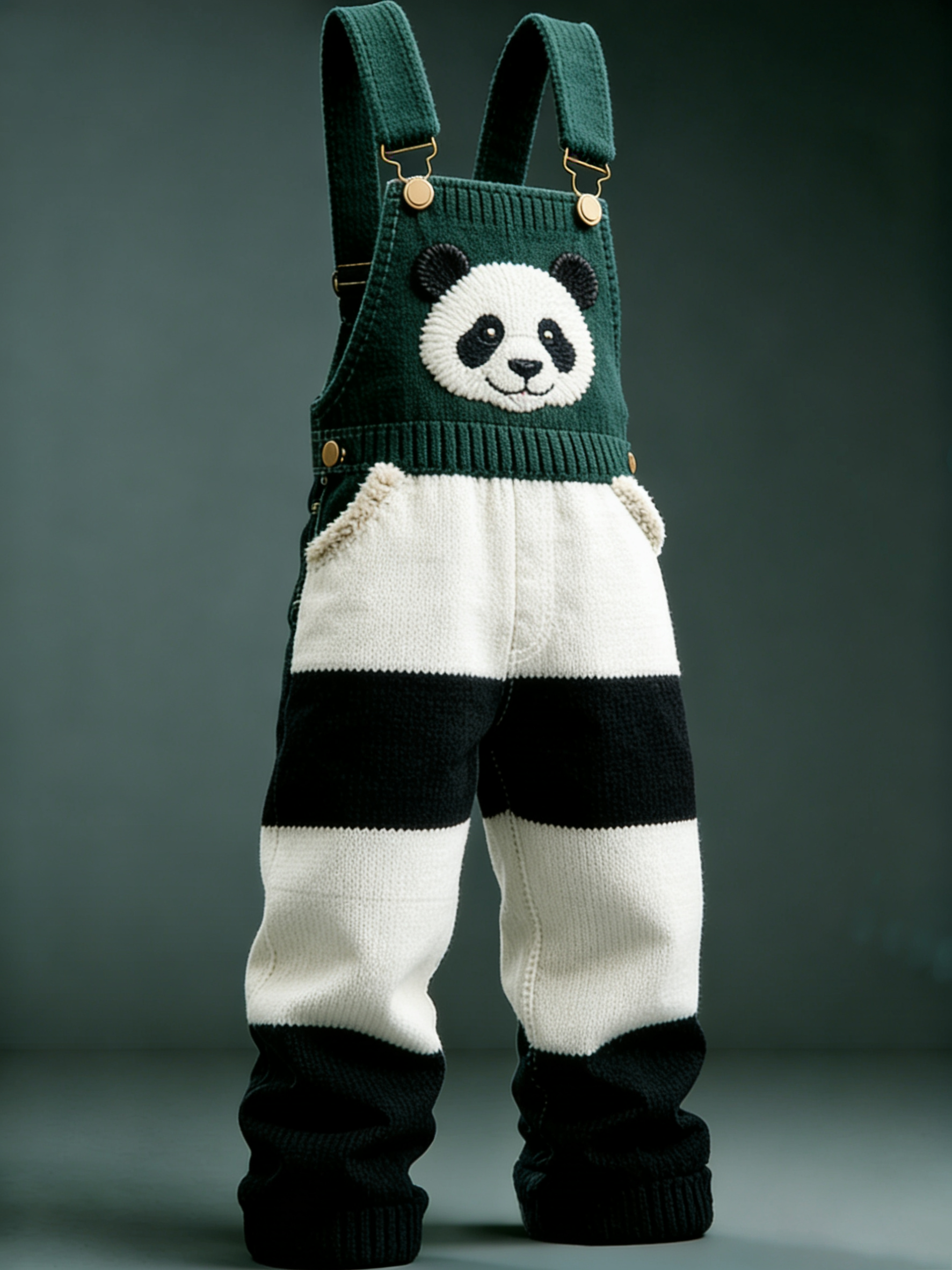 Men'S Panda Head Embroidered Black And White Striped Pants Legs Knitted Material Dark Green Overalls