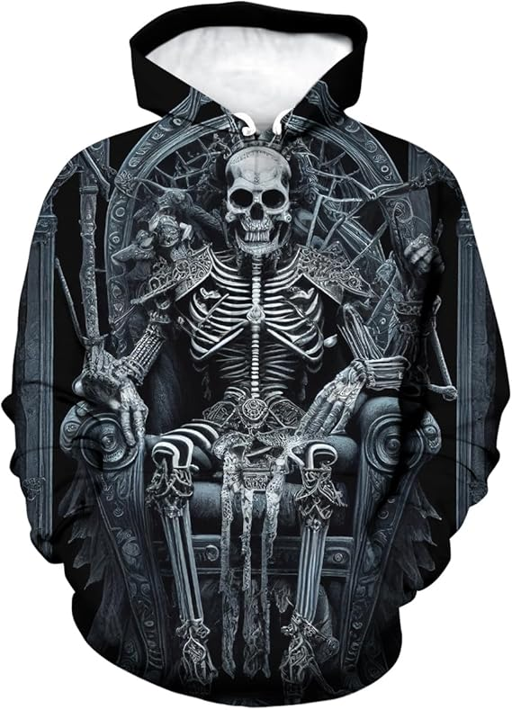 Men'S Skeleton King Sitting On Throne Printed Trendy Personalized Loose Hooded Top
