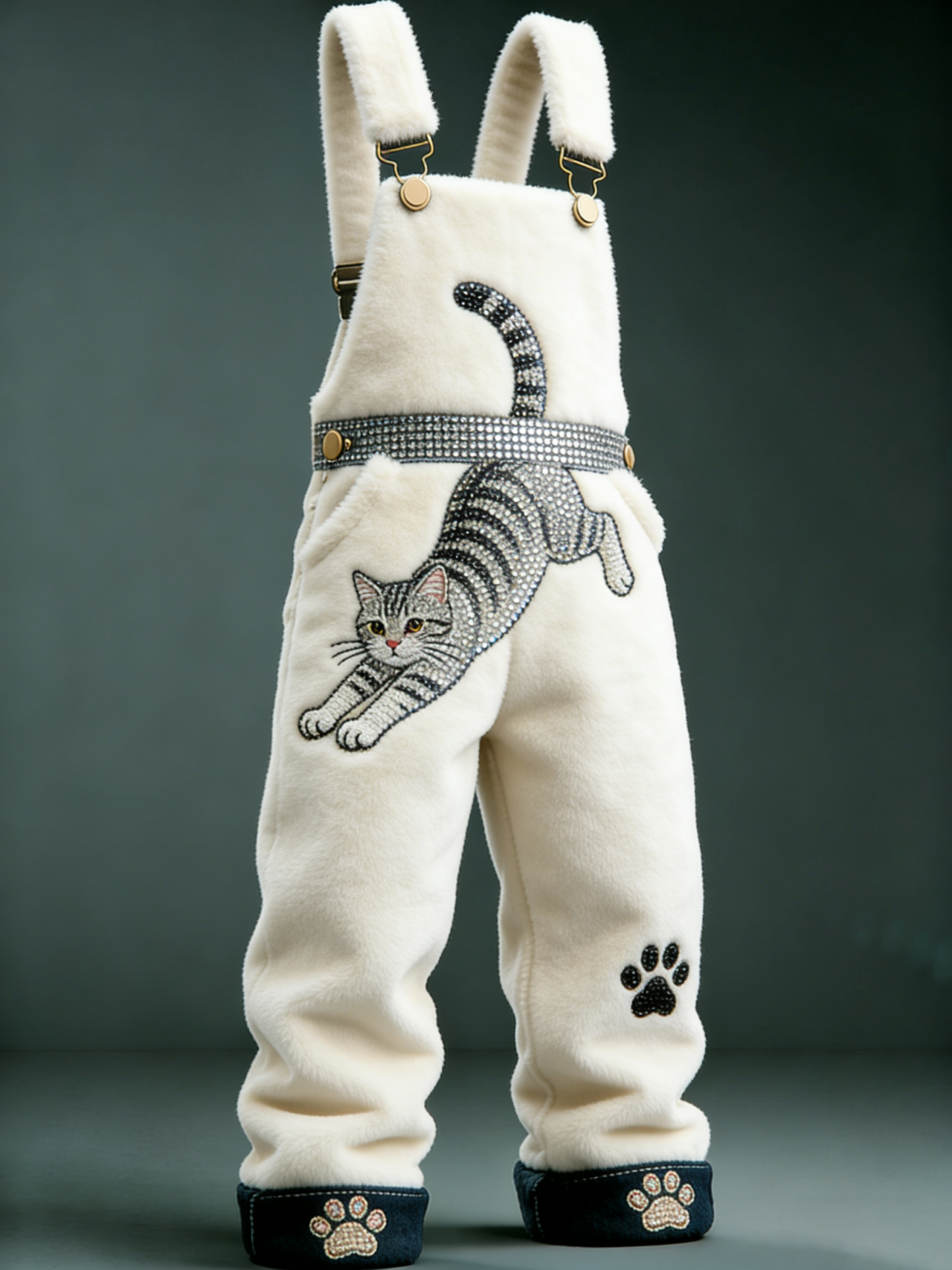 Men'S Striped Cat Embroidery Paw Print Decoration Diamond Belt, Warm And Comfortable Beige Plush Overalls