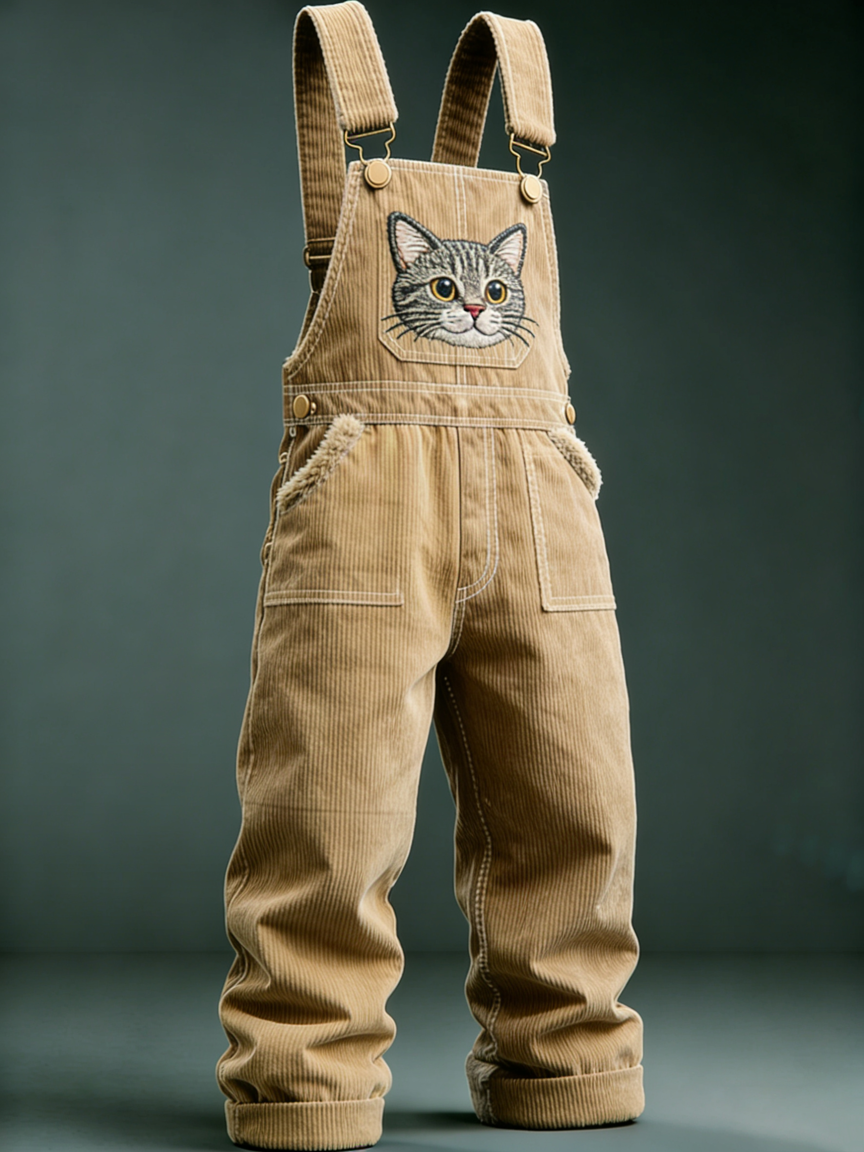Men'S Tabby Cat Embroidered Simple And Comfortable Khaki Corduroy Overalls