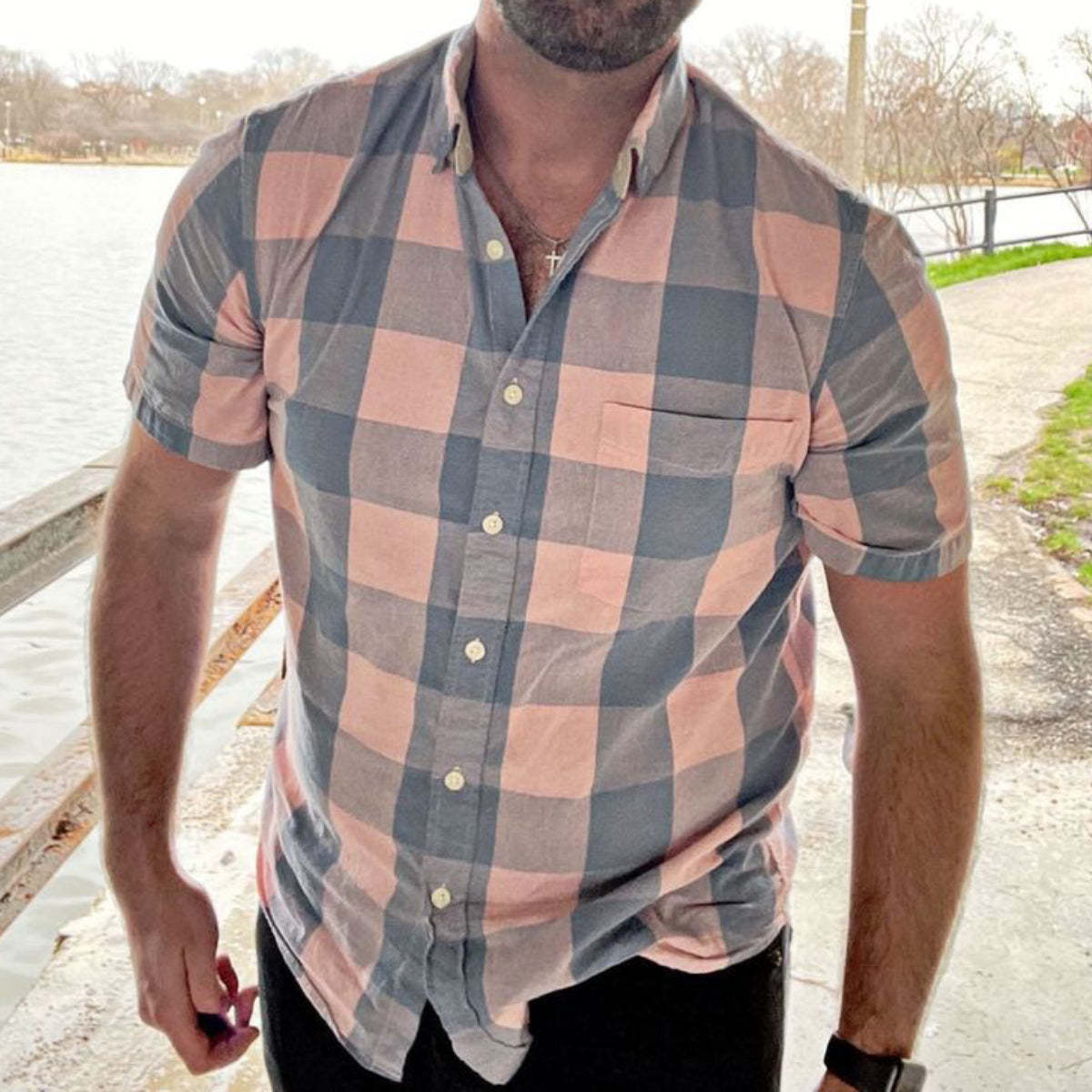 Our men's short-sleeved button-down shirts have been pre-shrunk and colorfast. They are machine washable or can be hand washed for easy care. While they're not wrinkle-free, they require minimal ironing for a crisp look.