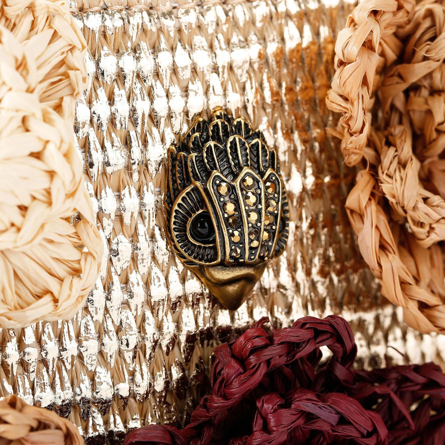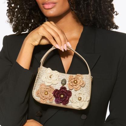 This Mini Bond Shoulder Flower Purse features a metallic gold woven exterior. Each of the 3D raffia flowers are dyed with antiqued brass studs at the center of each.