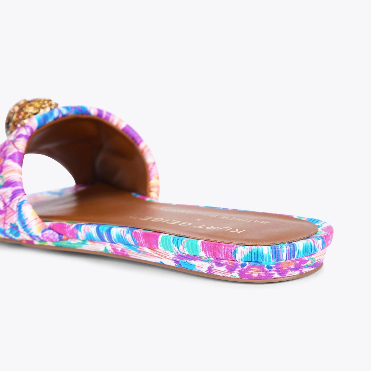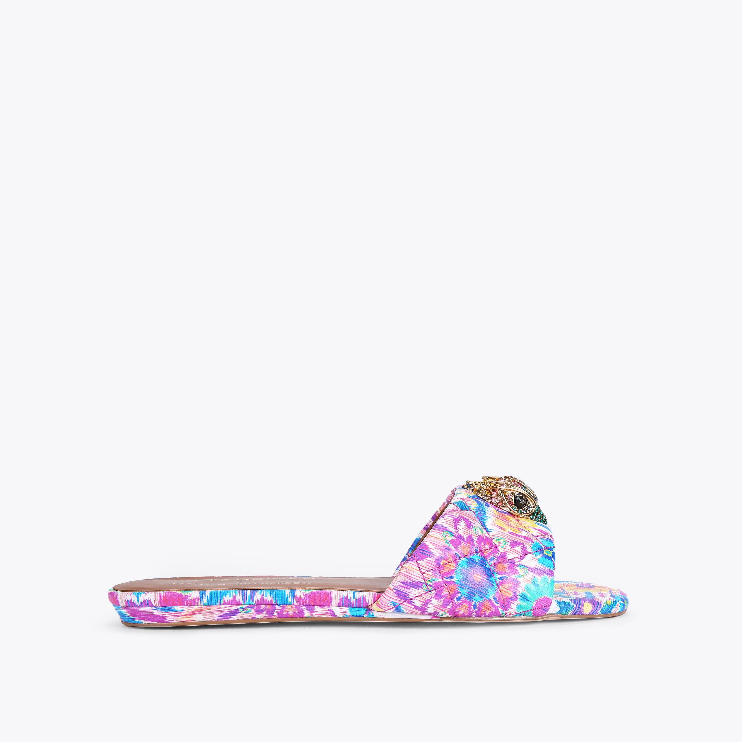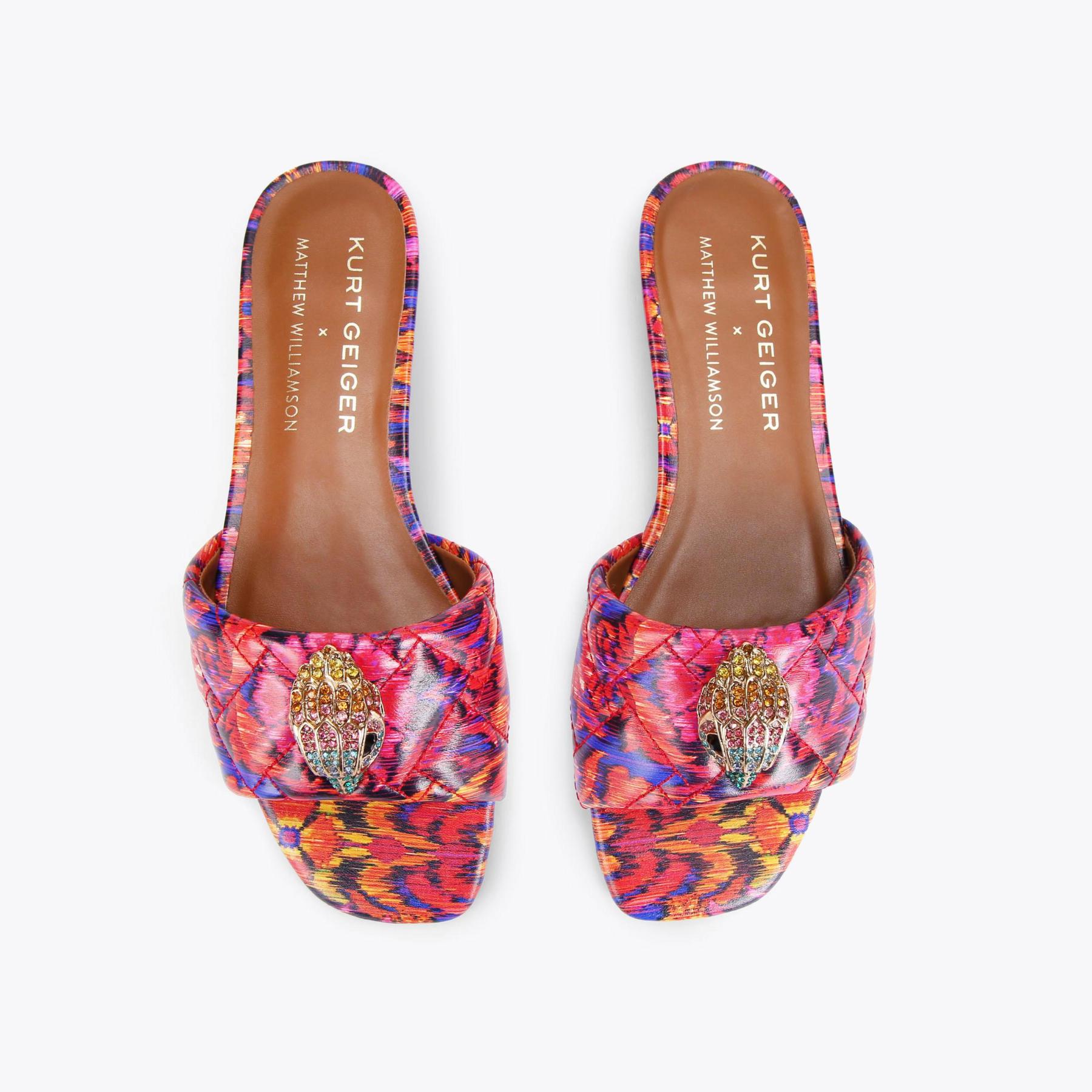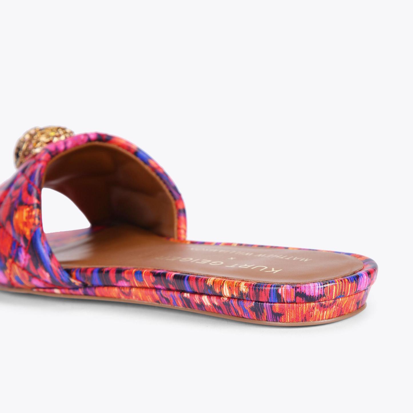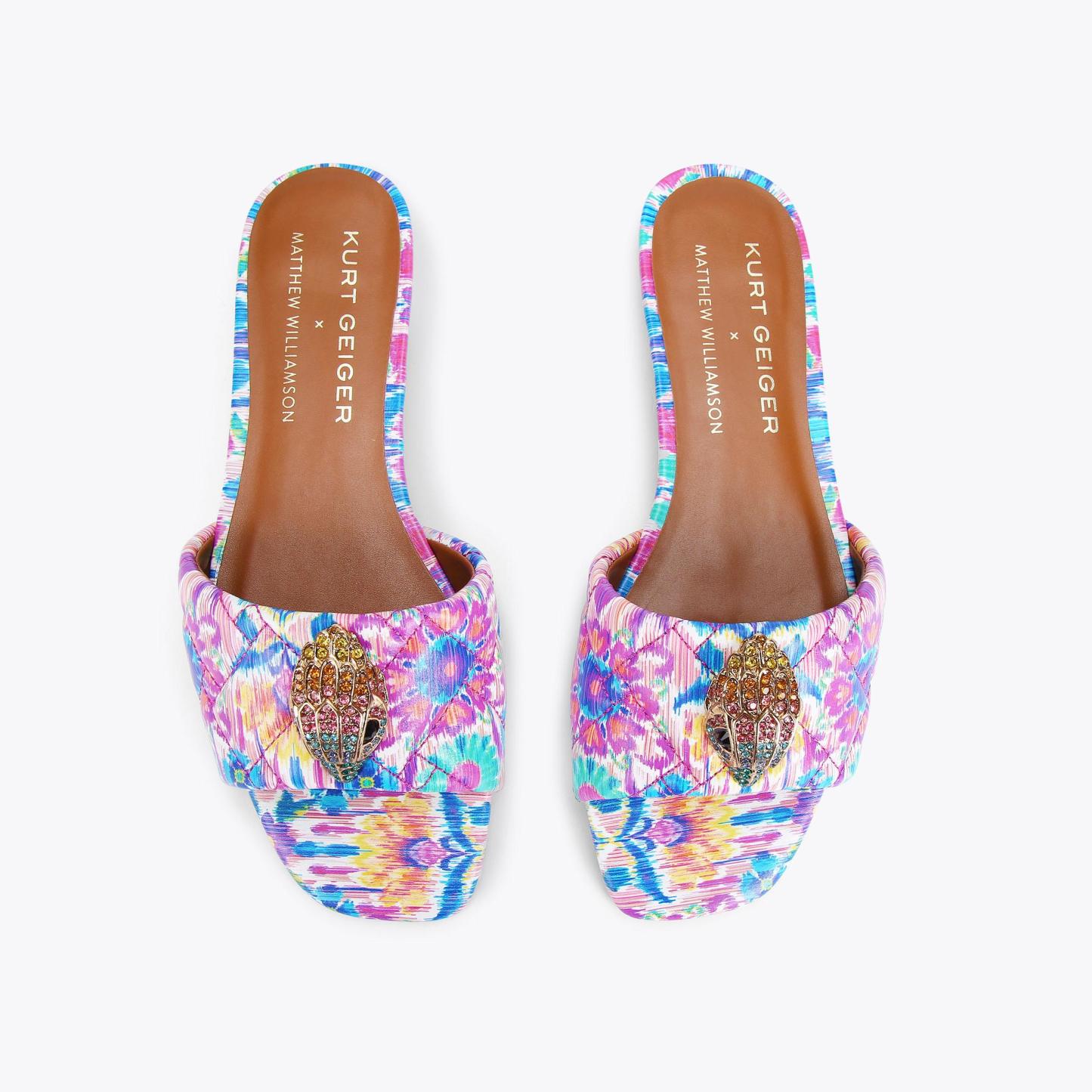 The Kensington Flat Sandal features a bespoke print created by iconic British fashion designer, Matthew Williamson. The floral motif is complemented with an abstract ikat design to create a beautiful bohemian print across the quilted upper. The go