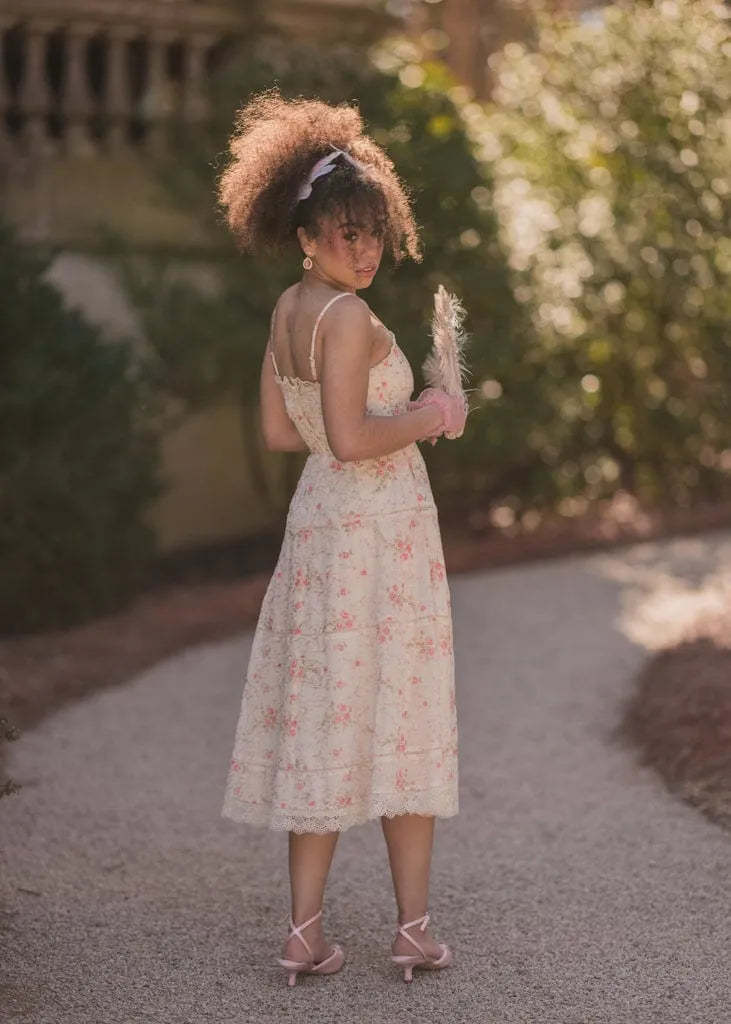 The Primrose Dress is a romantic blend of vintage charm and delicate details. Featuring a soft floral print with intricate lace trim and tiered accents, this dress captures timeless elegance. Adjustable spaghetti straps and a flattering silhouette make it a perfect choice for garden parties, tea gatherings, or summer celebrations. Its effortless grace ensures you'll feel both comfortable and enchanting.