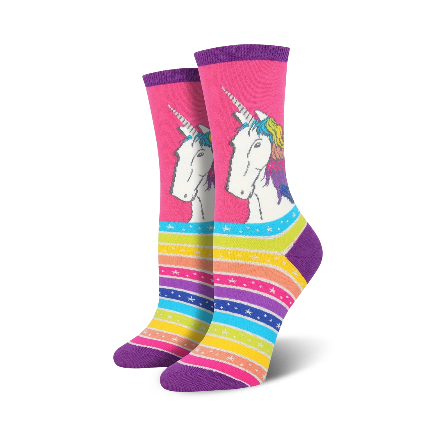 Shine bright like the amazing, mythical creatures that we know of as... unicorns! Unicorn lovers will appreciate the beauty of these majestic women's novelty crew socks. Each cool pair features a portrait of a unicorn printed against a pink background. There are colorful stripes and stars showcased too. Slip these on and let your feet experience the magic!