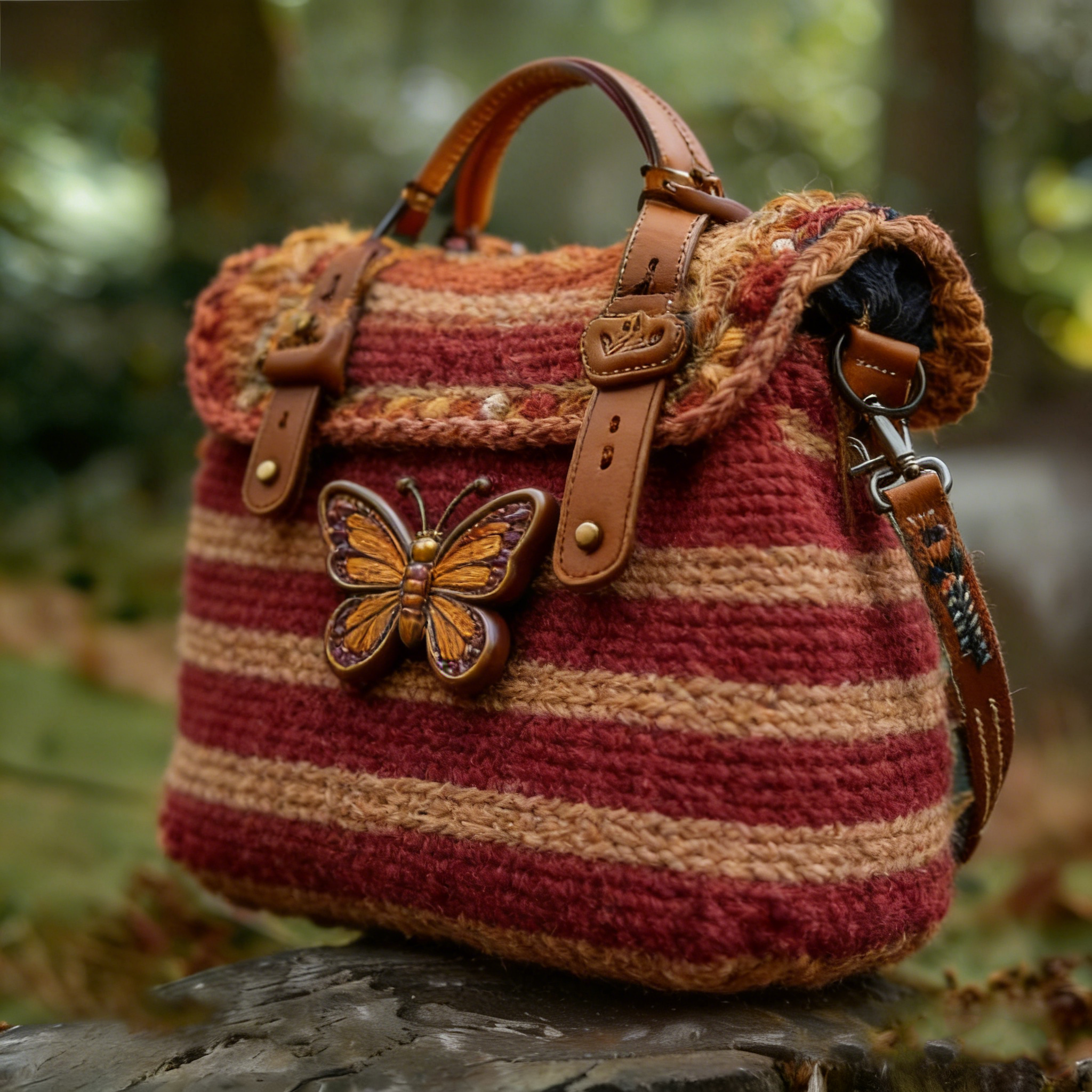Red Brown Striped Butterfly Pattern Woven Crossbody Single Shoulder Handbag