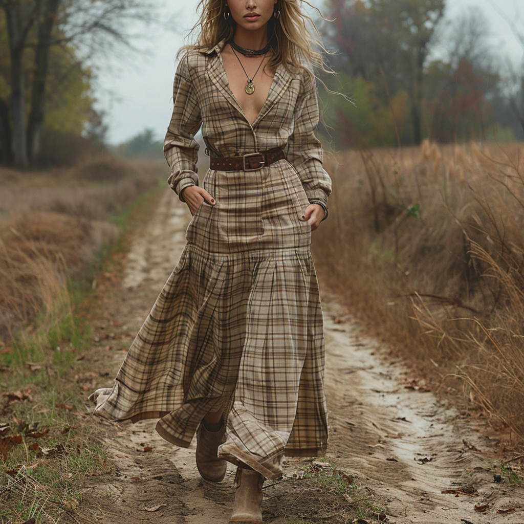 Women's Vintage V-neck Bohemian Pastoral Style Long-sleeve Maxi Long Dress
