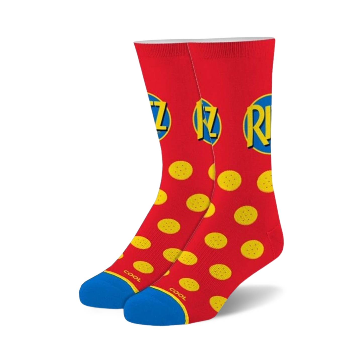 Ritz Cracker Socks: Get ready to feel snazzy in these red socks adorned with cheerful yellow polka dots and a blue heel and toe. Contrary to their name, these socks won't end up in a cup of soup ��they're just plain scrumptious. Perfect for both men and women, they're guaranteed to leave your feet craving more! (Also available in ankle length)