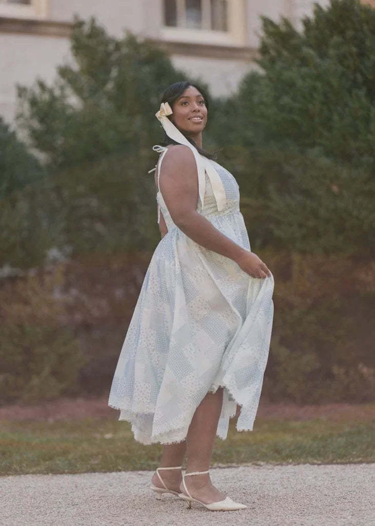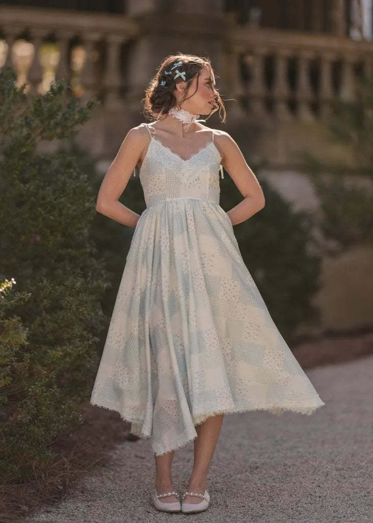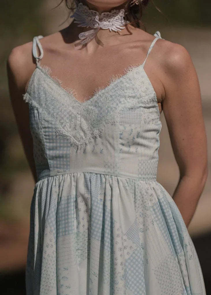 The Robyn Dress is a charming patchwork-inspired design that radiates rustic elegance. Featuring a soft blue and white palette with delicate floral and gingham prints, this dress is perfect for casual summer outings or picnics. Adjustable tie straps and a flowing handkerchief hem add a touch of whimsy, while lace trim provides a dainty, vintage finish. It's the perfect blend of comfort and effortless style.