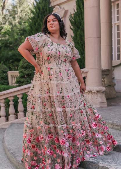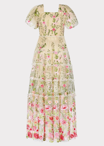 The Rose Dress is a stunning piece that will transport you to a world of whimsy and romance. Pink/yellow roses and elegant ruffles cascade down the skirt, adding a touch of femininity and movement to every step.