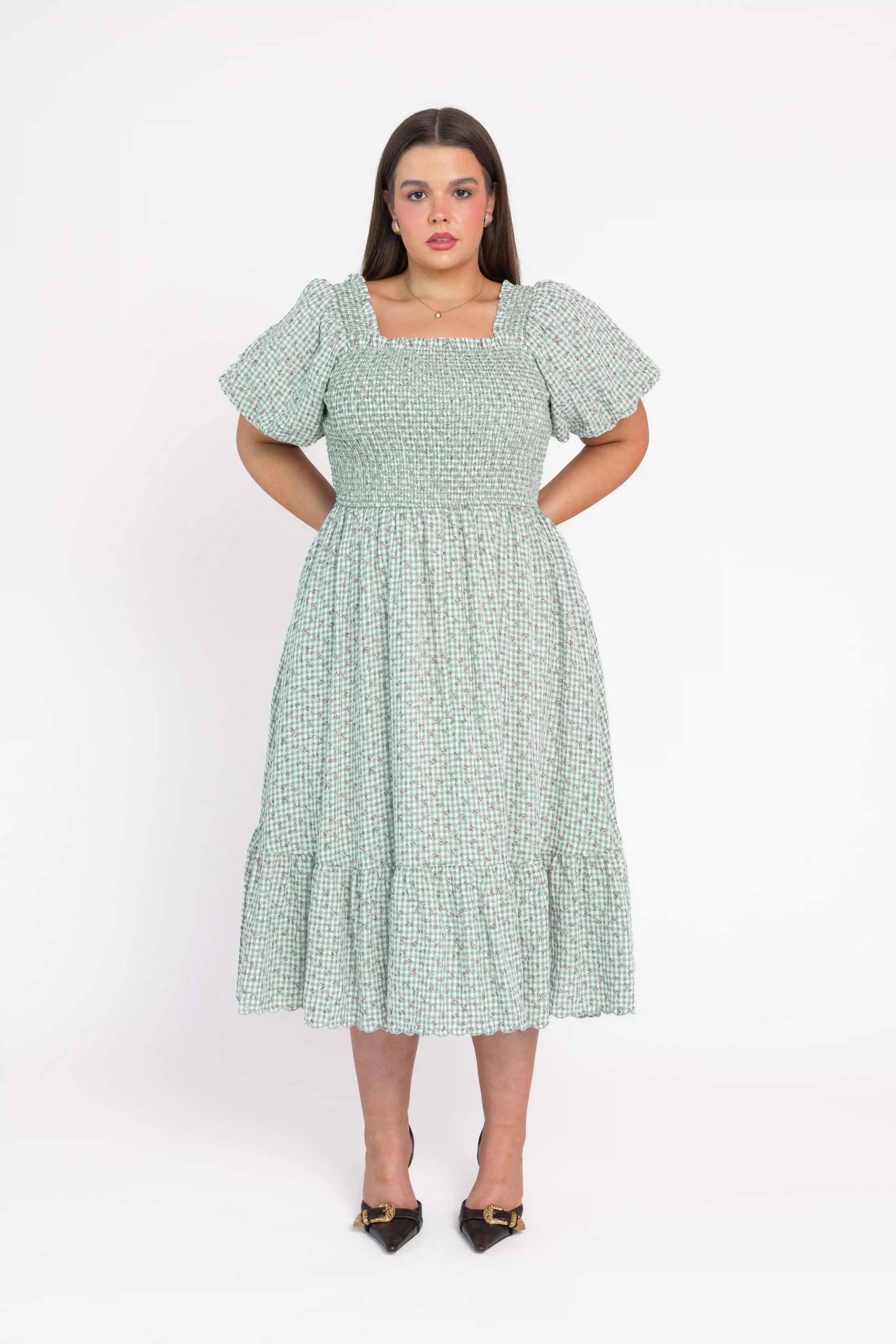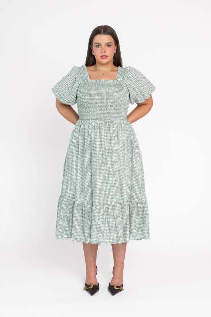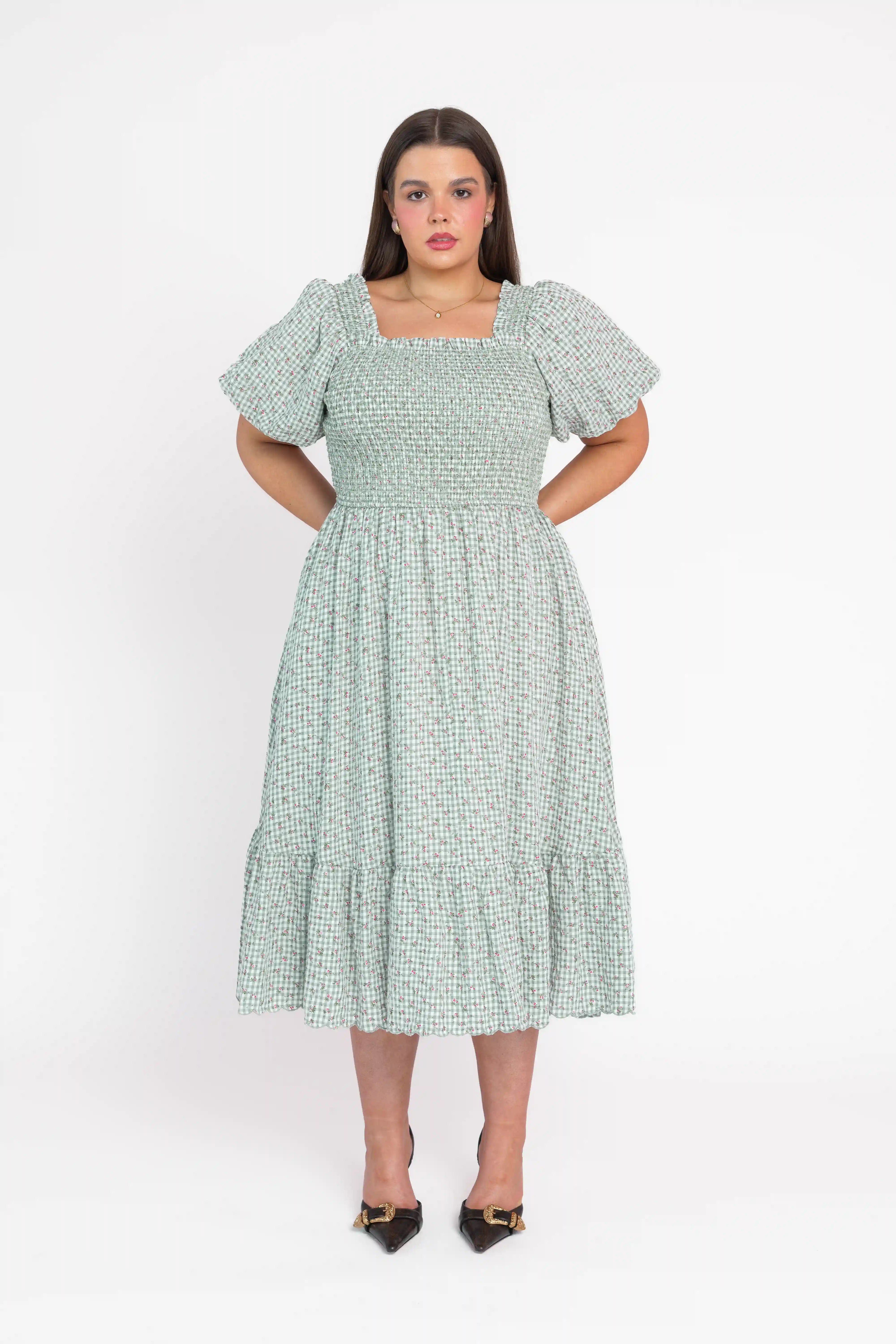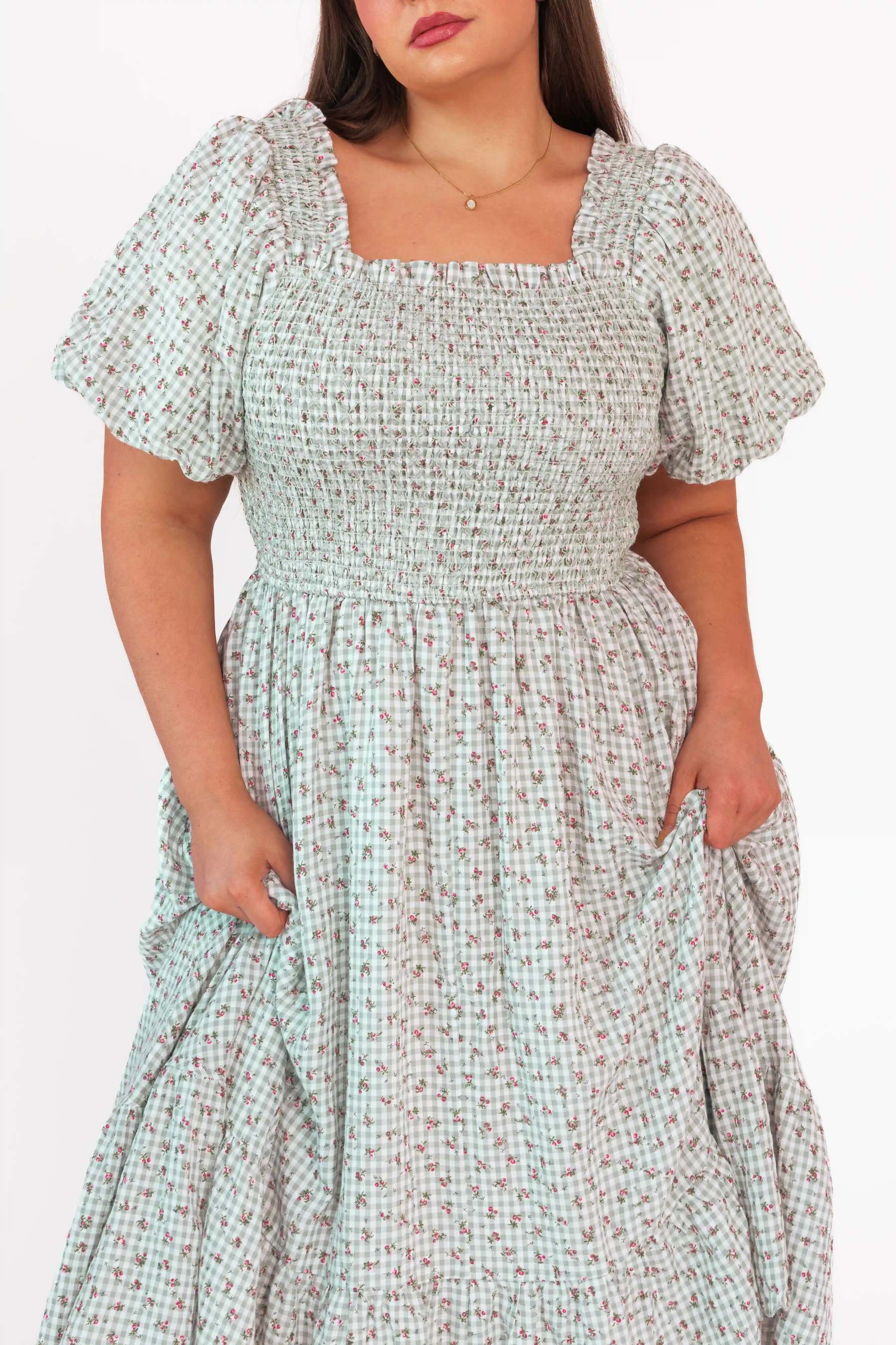 A midi dress featuring a smocked bodice and softly flared skirt, designed in a layered floral print over a classic gingham pattern. Finished with discreet side pockets, the silhouette balances ease and feminine detail.