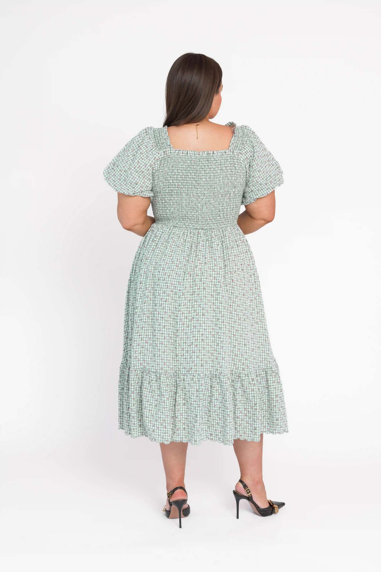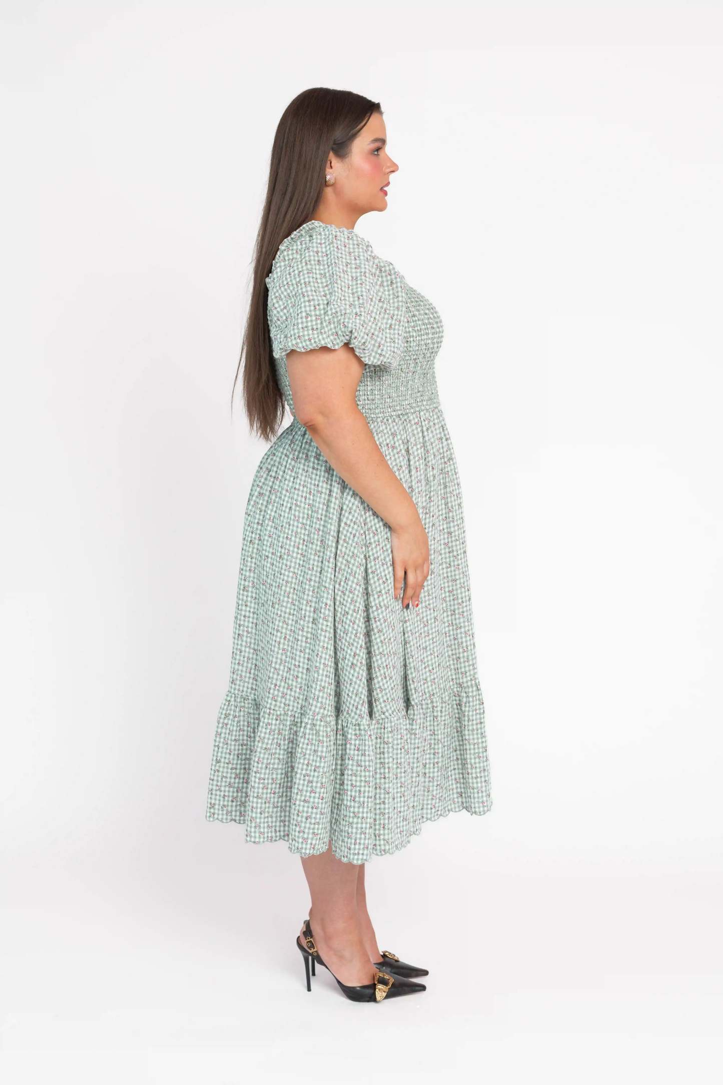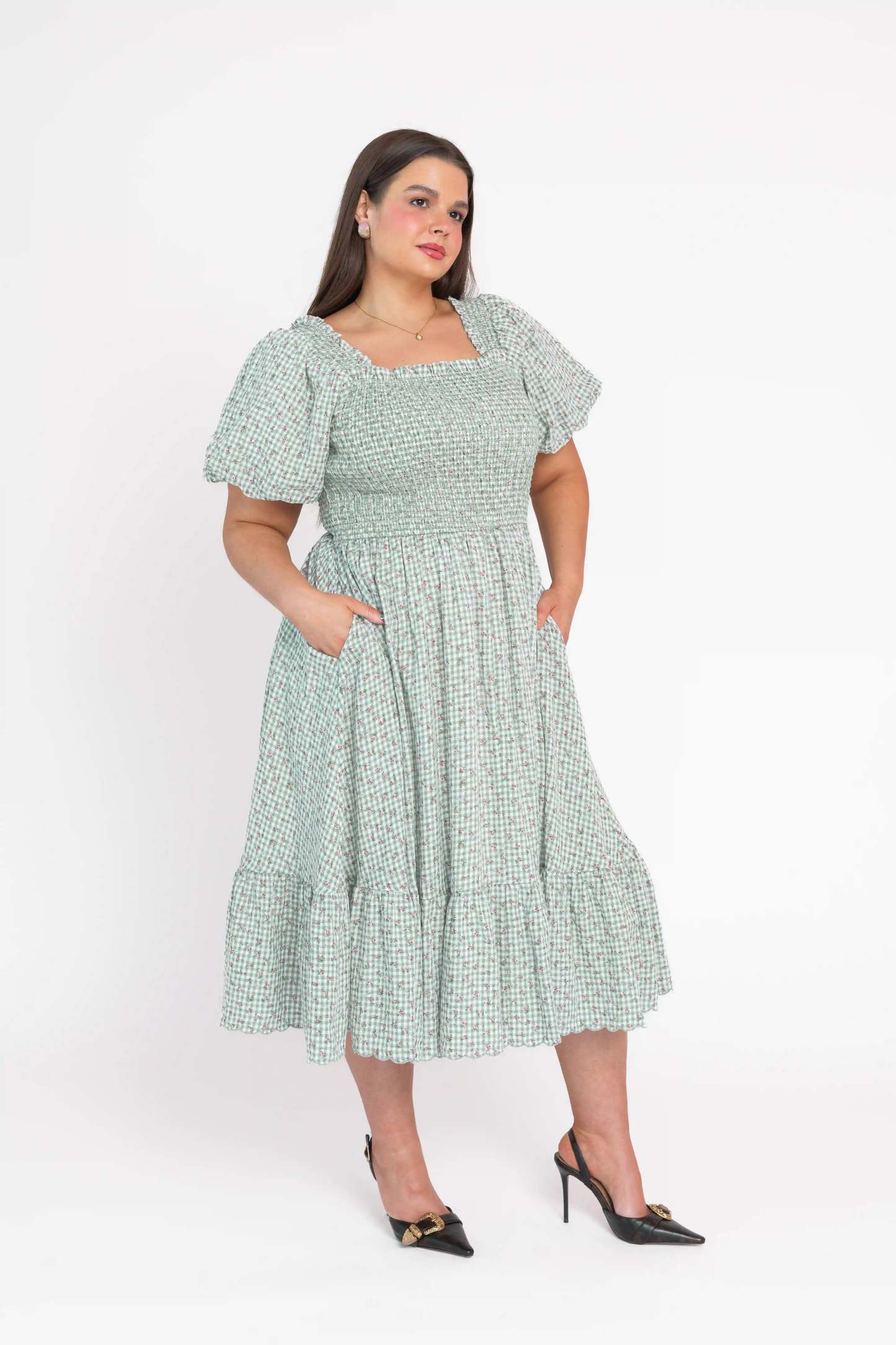 A midi dress featuring a smocked bodice and softly flared skirt, designed in a layered floral print over a classic gingham pattern. Finished with discreet side pockets, the silhouette balances ease and feminine detail.