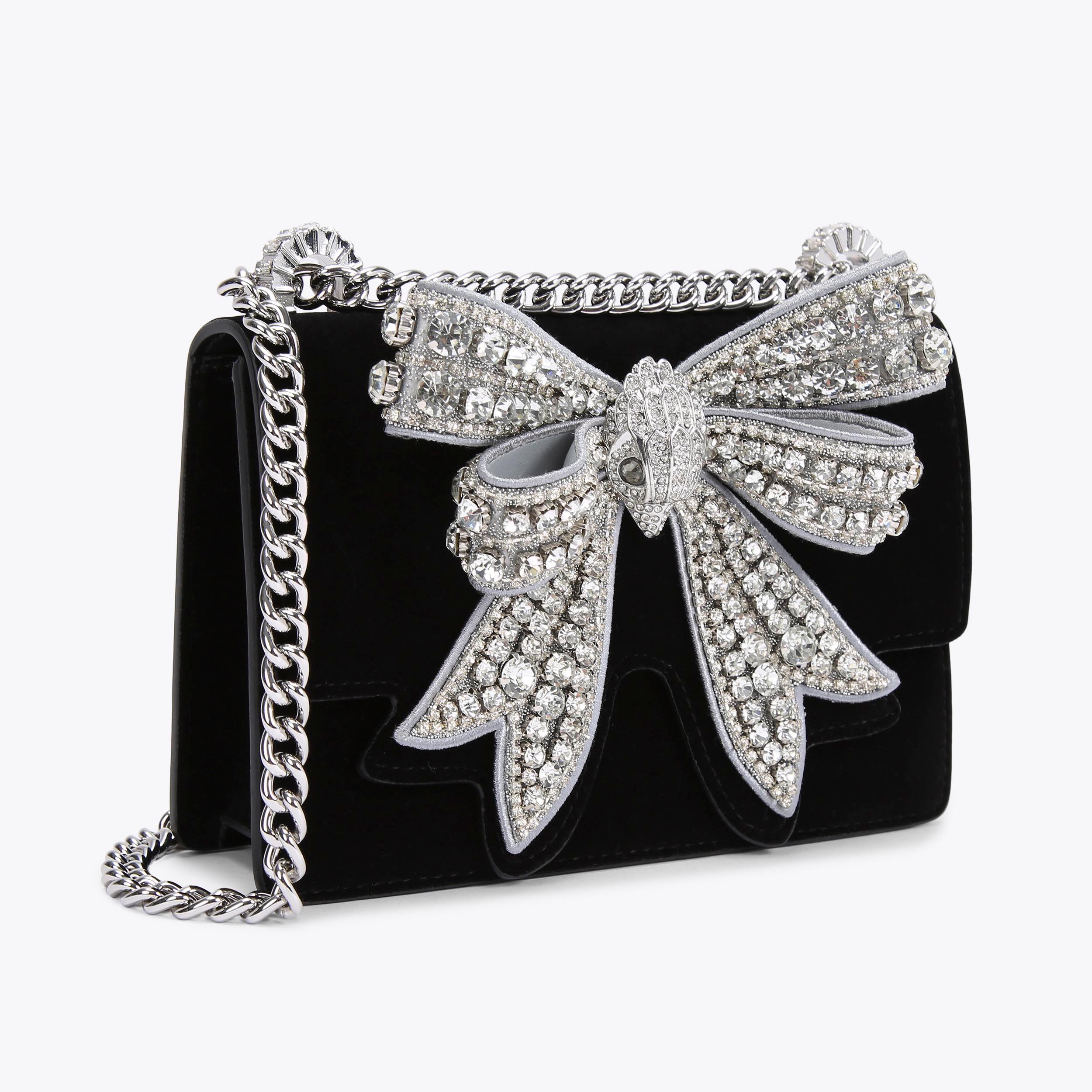 The Small Shoreditch Cross Body is crafted from a soft black velvet. The front flap is topped with crystal embellished bow with a silver Eagle head in the centre.