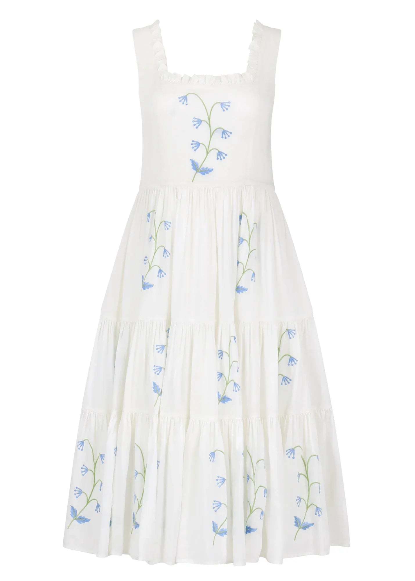 Embrace the serene beauty of the outdoors with our Summer Meadow Dress. This enchanting white dress features delicate blue floral embroidery and a tiered skirt that flows gracefully with every step. The fitted bodice and charming bow detail at the neckline add a touch of romantic elegance, making it perfect for picnics and sunny afternoon strolls. Complete with a wide-brimmed hat and a vintage bicycle, the Summer Meadow Dress captures the essence of idyllic summer days.