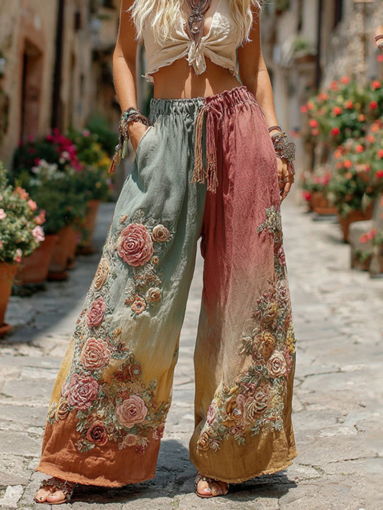 The Ice Cream Collection Women's Classic Bohemian Floral And Rose Gradient Art Linen Pants