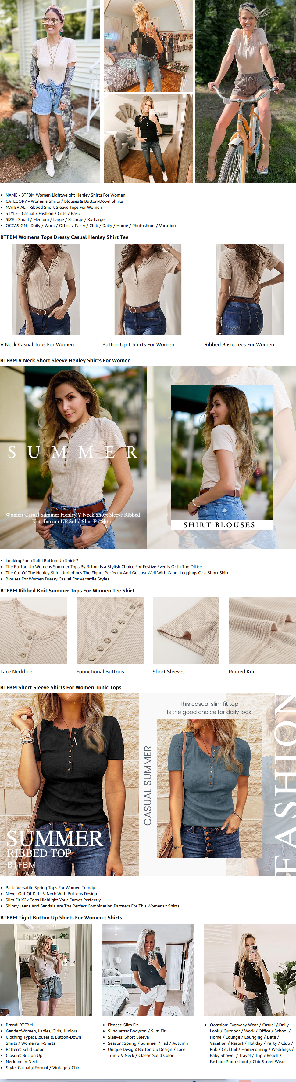 BTFBM Women Summer Henley Tunic Top V Neck Short Sleeve Button UP Solid Slim Fit Casual Ribbed Knit Shirt Blouses