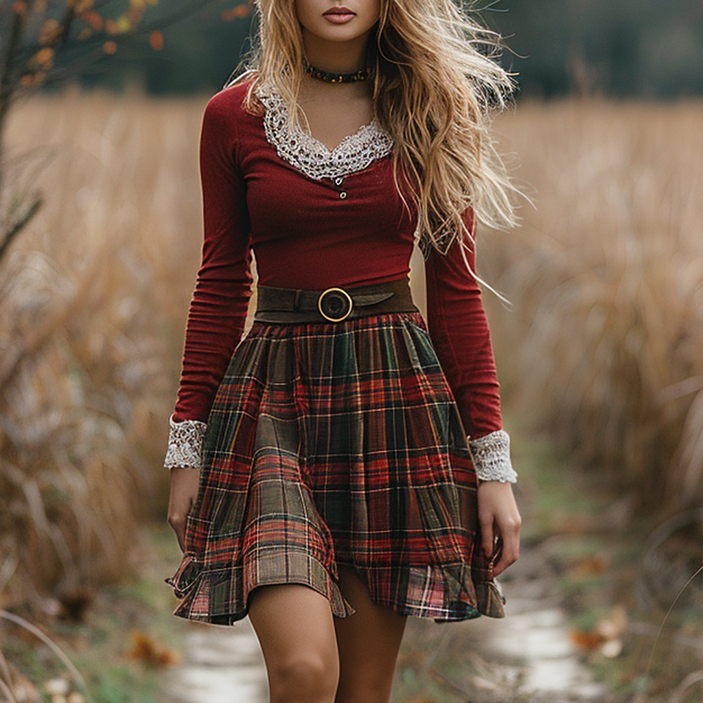 Women's Autumn And Winter Long-sleeve Dress Short Skirt Christmas Plaid Skirt