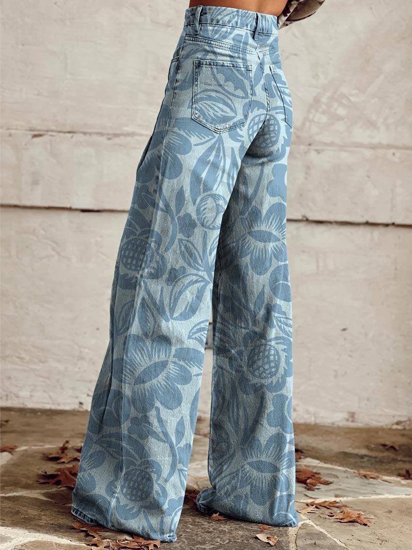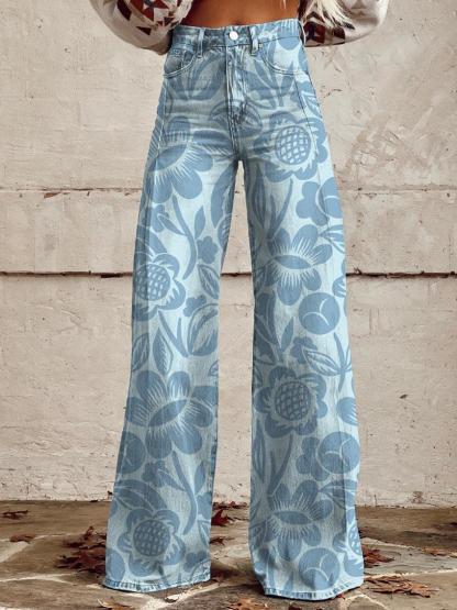 Women's Blue Geometric Flower Print Casual Wide Leg Pants