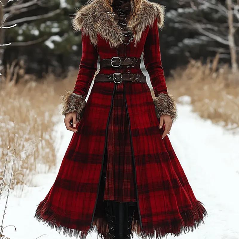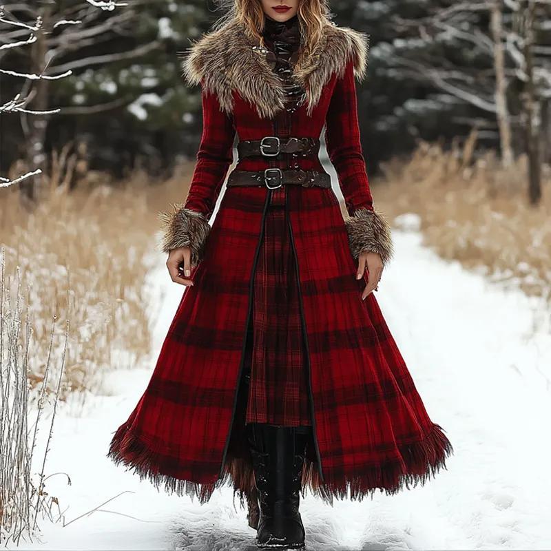 Women's Christmas Woolen Fox Fur Splicing Dress Tartan Print Double Breasted Overcoat