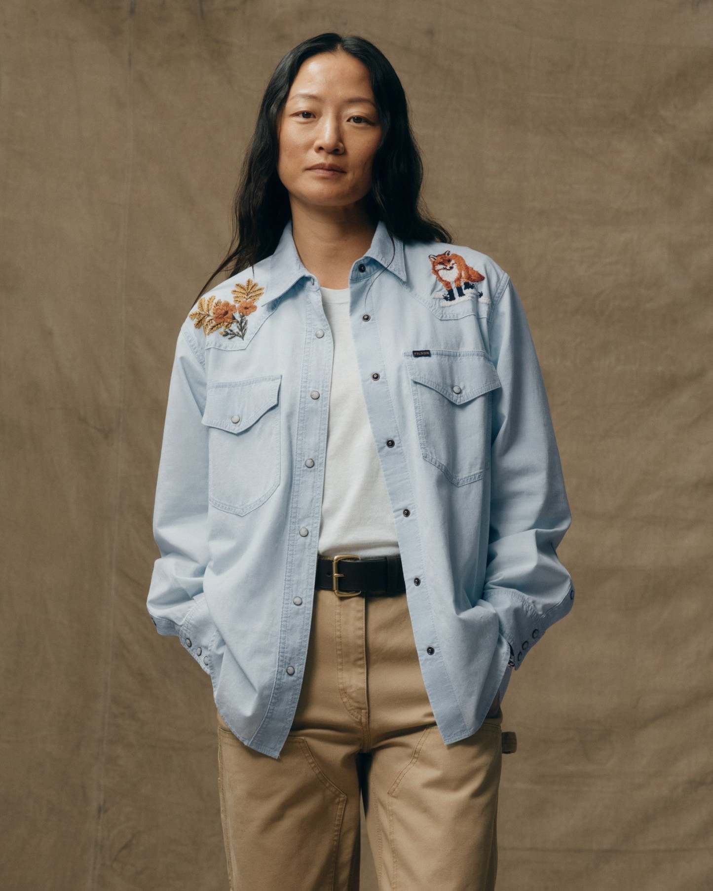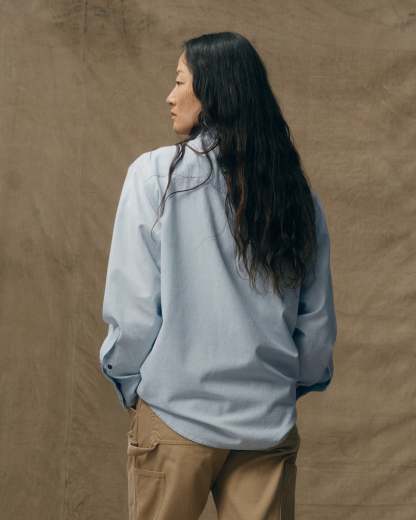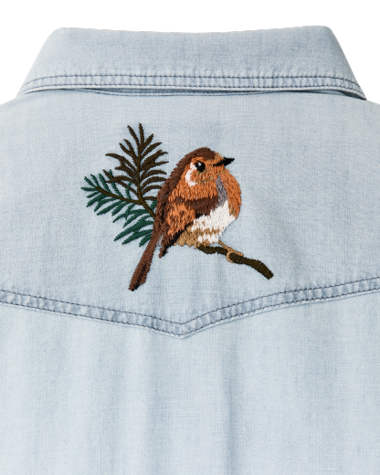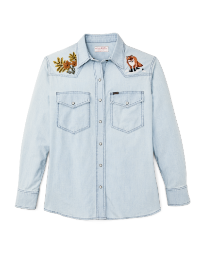 A Western-style shirt made with cotton chambray, a lightweight and durable fabric rooted in classic workwear. True to tradition, the pockets and yoke are pointed and the front and cuffs secure with snaps. Wildlife embroidery on the front yoke and back add a bit of flair. Spread collar and shirttail hem.