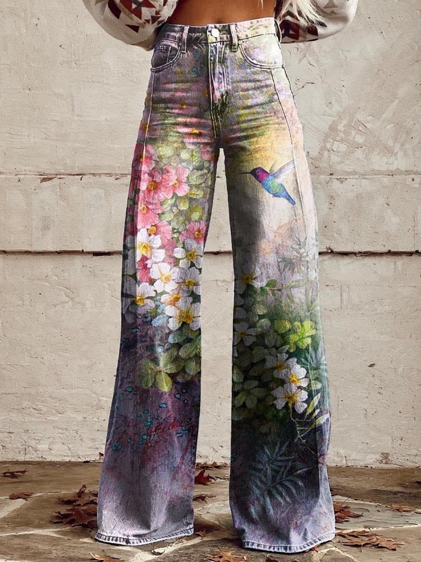 Women's Floral Hummingbird Print Casual Wide Leg Pants