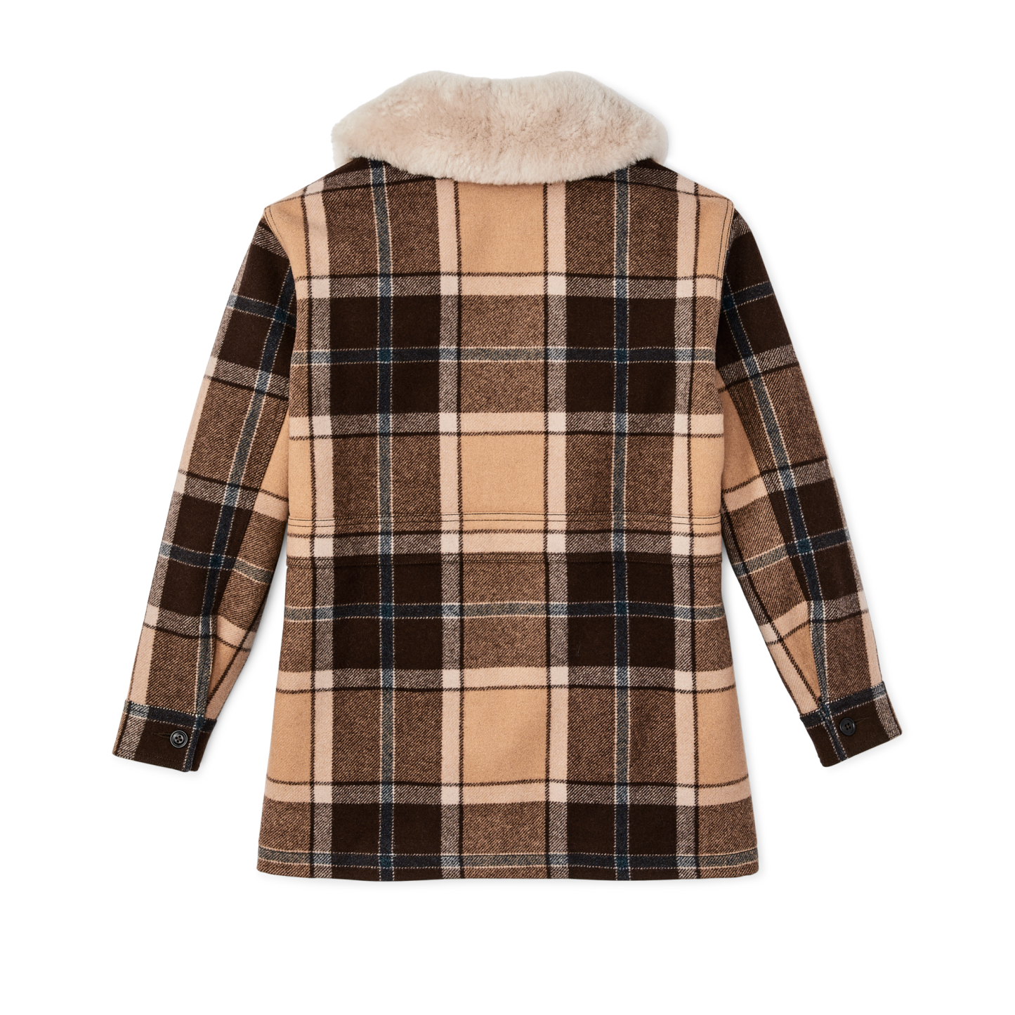 This warm wool coat is from the Filson archives, originally designed for ranchers on horseback. It's made with the iconic Mackinaw Wool, our signature fabric with a 120-year legacy of weather protection. Cut a bit longer for added coverage, the torso is lined with cotton twill for added warmth and comfort. The sleeves are lined with polyester twill that slides easily over layers. The luxuriously soft sheepskin shearling collar provides coverage to the ears when extended, and can be secured at the throat with a buttoning tab. Button-front closure and snap-adjustable cuffs. Two front cargo pockets with snapped flaps.