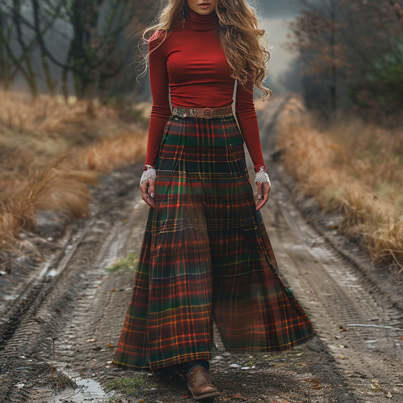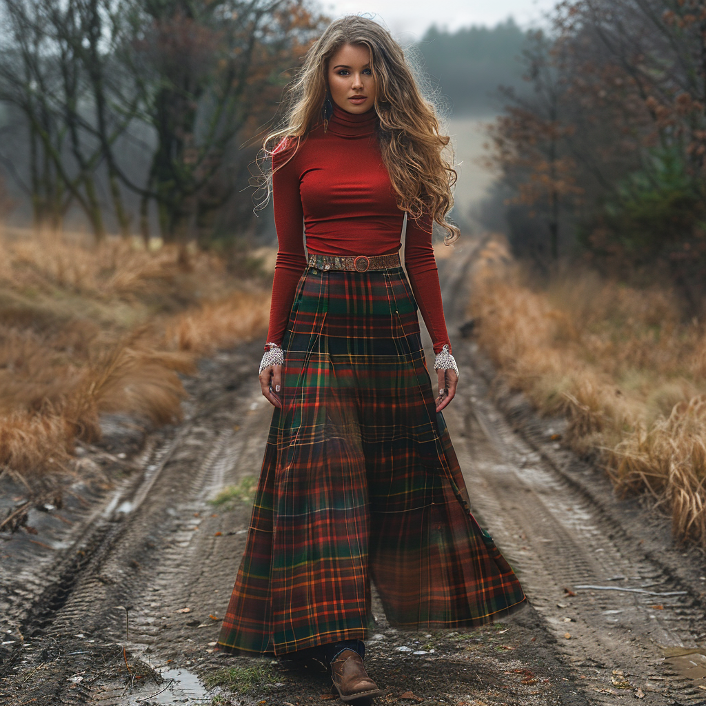 Women's Retro High Neck Long-sleeve Long Skirt Plaid Pastoral Style Maxi Long Dress