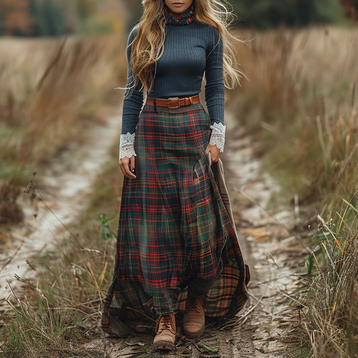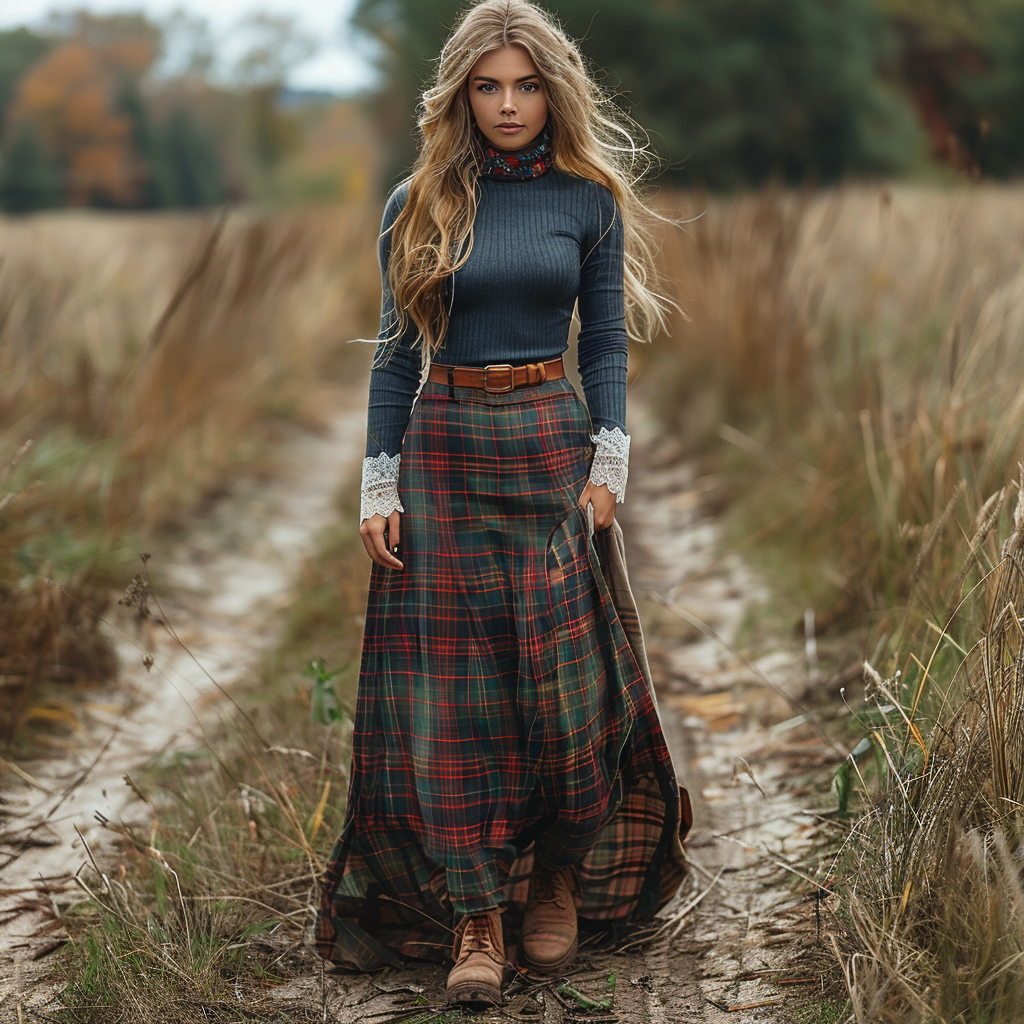Women's Retro High Neck Long-sleeve Long Skirt Plaid Pastoral Style Maxi Long Dress