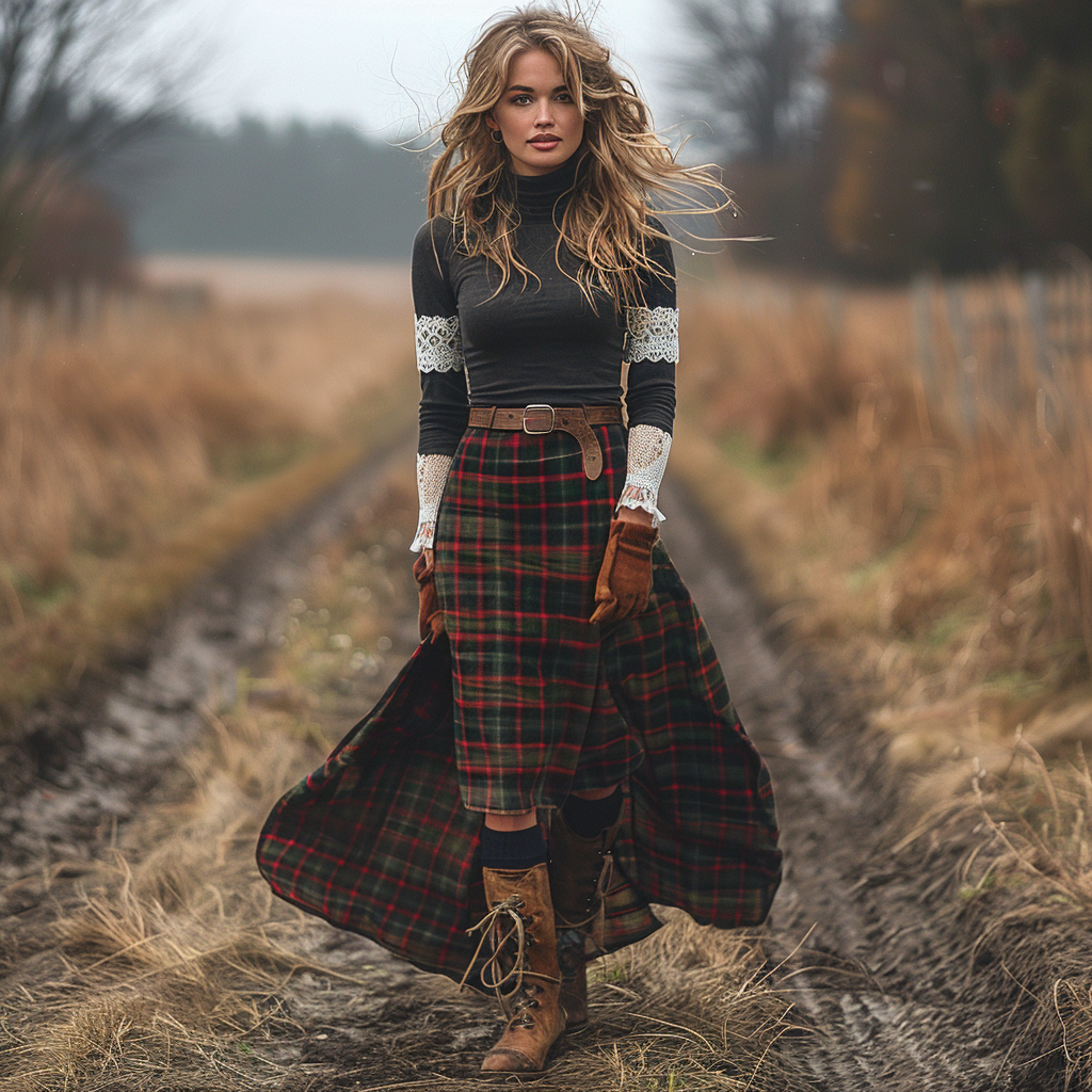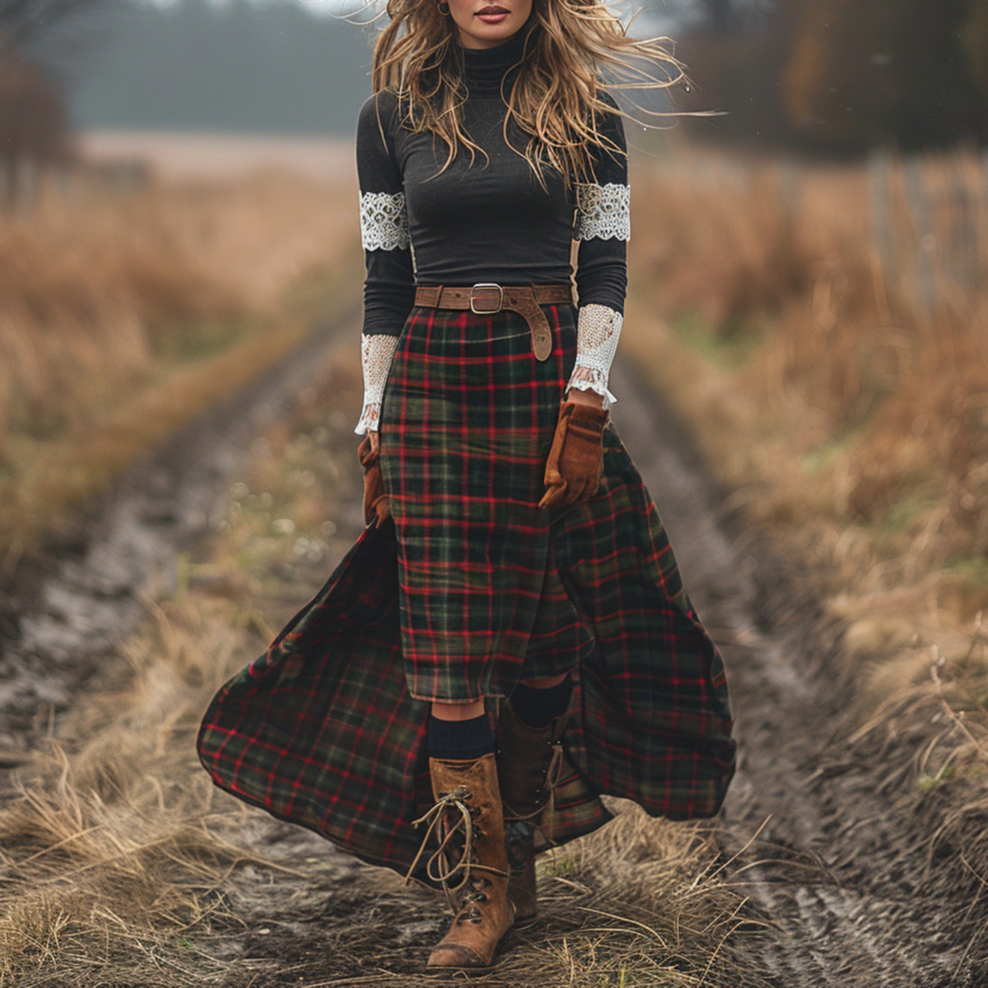 Women's Retro High Neck Long-sleeve Long Skirt Plaid Pastoral Style Maxi Long Dress