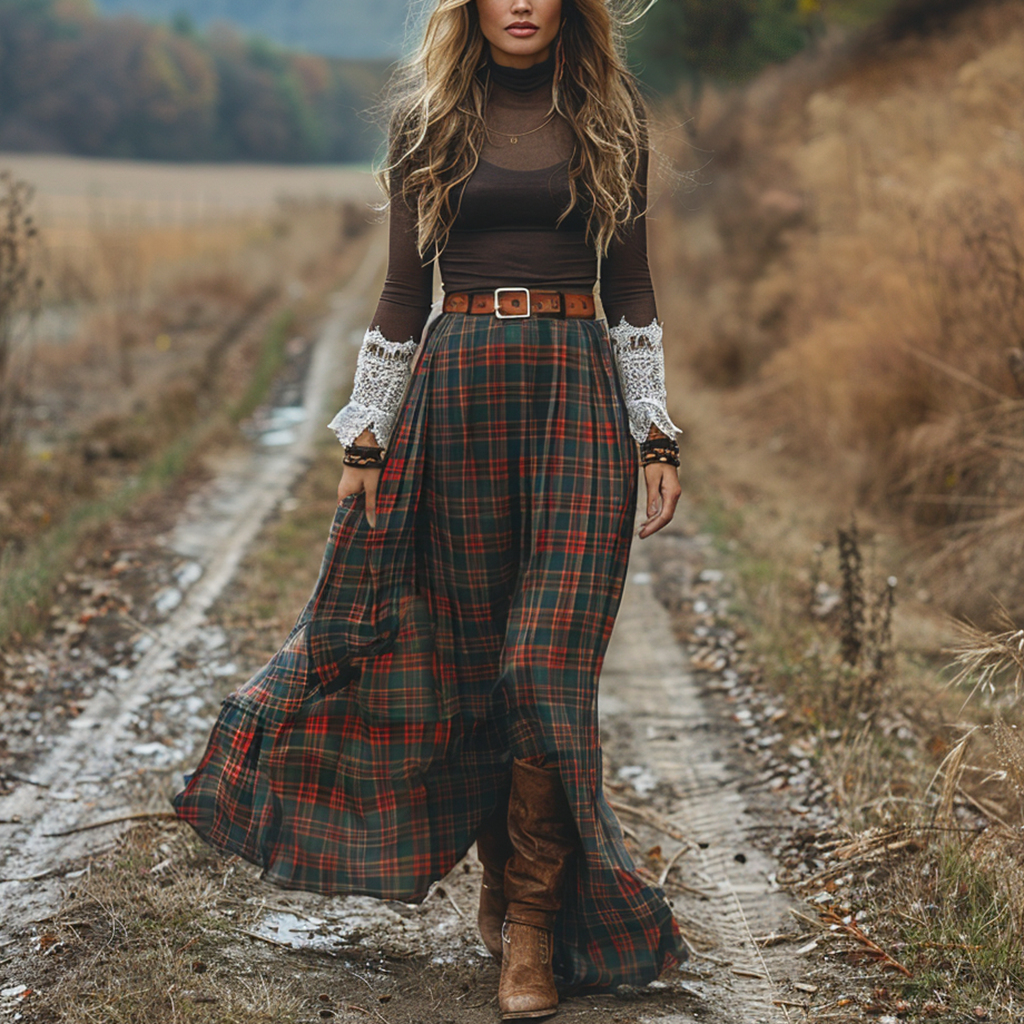 Women's Retro Plaid High Collar Long Sleeve Long Skirt Pastoral Style Maxi Long Dress