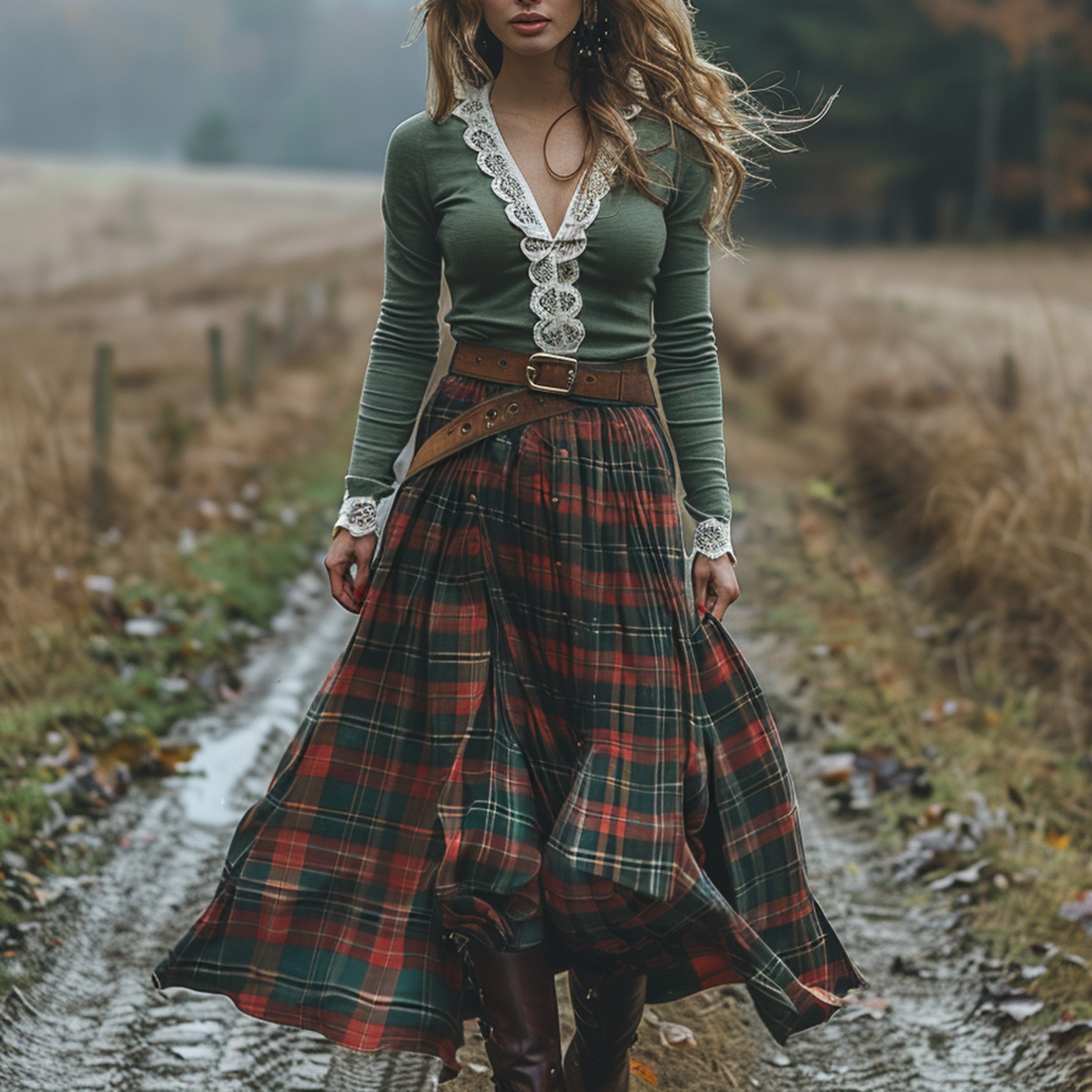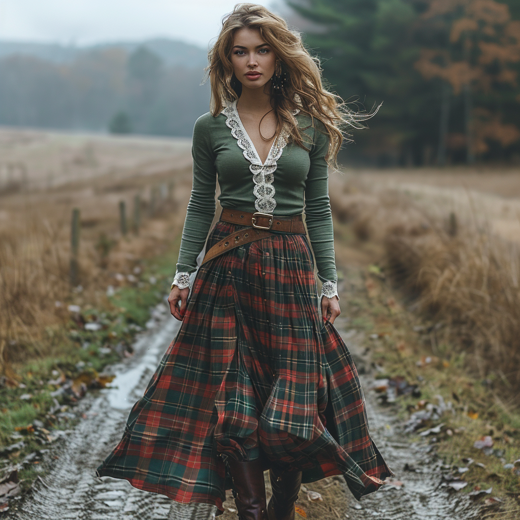 Women's Retro Plaid V-neck Long-sleeve Long Skirt Pastoral Style Maxi Long Dress