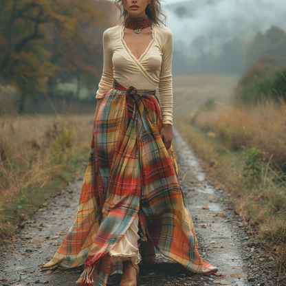 Women's Retro Plaid V-neck Long-sleeve Long Skirt Pastoral Style Maxi Long Dress