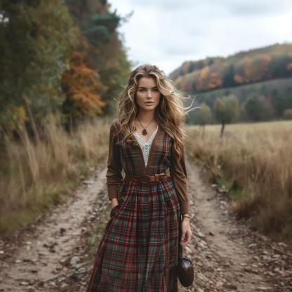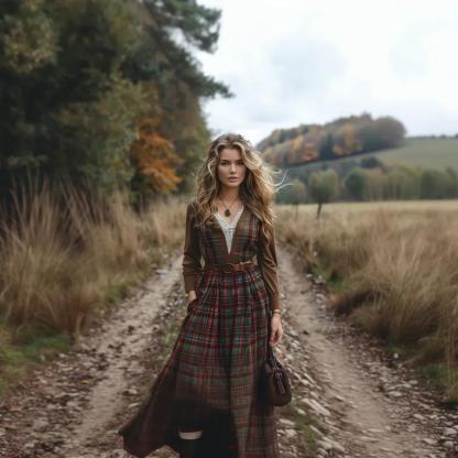 Women's Retro Plaid V-neck Long-sleeve Long Skirt Pastoral Style Maxi Long Dress
