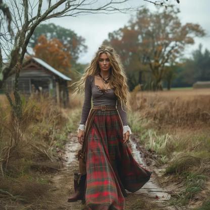 Women's Retro Plaid V-neck Long-sleeve Long Skirt Pastoral Style Maxi Long Dress
