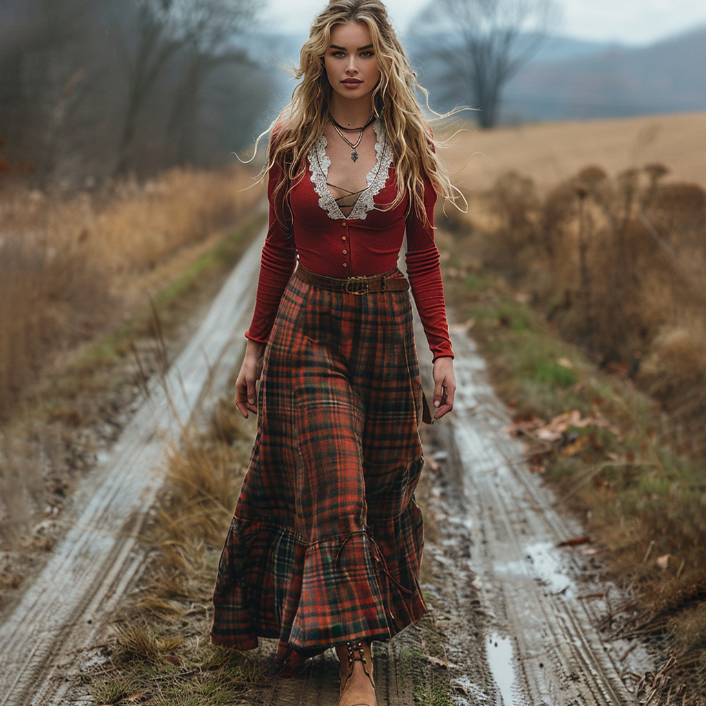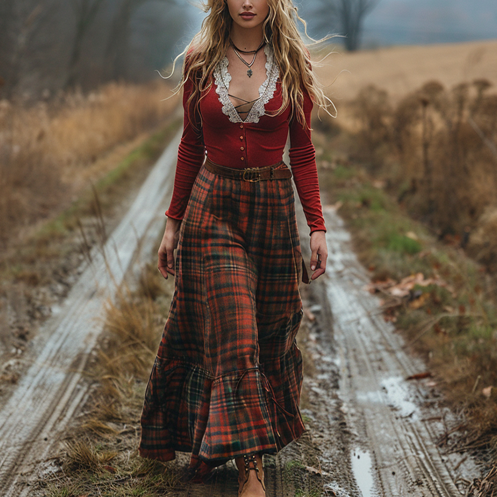 Women's Retro Plaid V-neck Long-sleeve Long Skirt Pastoral Style Maxi Long Dress