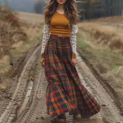 Women's Retro Round Neck Long-sleeve Long Skirt Plaid Pastoral Style Maxi Long Dress